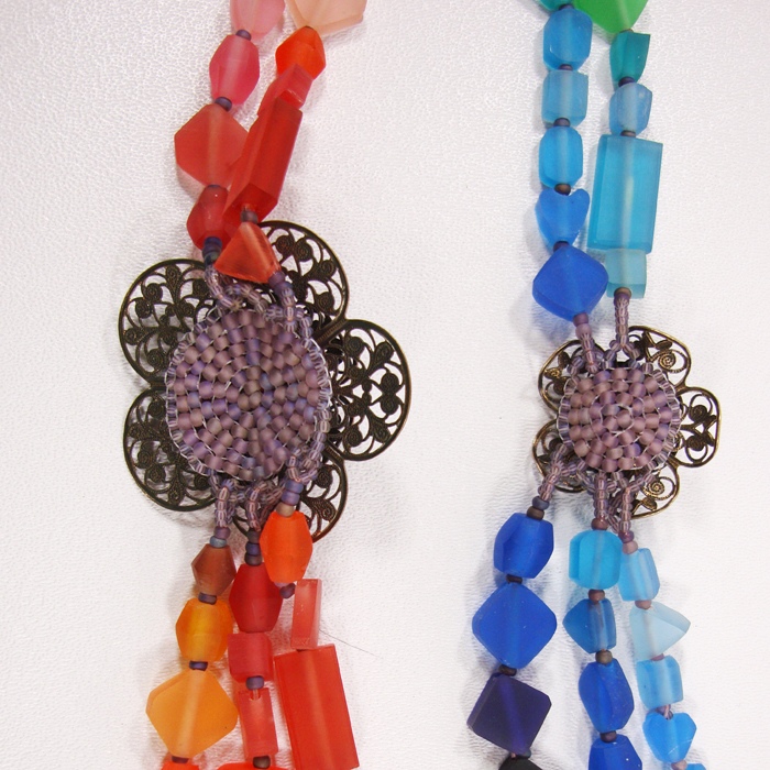 Since just returning from a trip to China, I decided to use a distinctly Chinese influence in creating the second necklace both is the bright red colors of the resin beads and the tassel formation. I began by starting to make a brick stitched seed bead circle for support but then decided that I could save time by using circles cut from ultrasuede. The ultrasuede would also serve the purpose of protecting the large resin disc from being scratched by the glass beads. I used 2 layered circles on the back and another smaller circle between the filagree flower and the disc. The filagree flower was stitched through the ultrasuede layers to the large resin disc through the center with 10 lb fireline. I stitched the conso braided nylon upholstery thread through the ultrasuede and strung the resin beads with size 8 glass bead spacers on it, knotting and gluing the knots at the toggle. Repeat for the tassel.